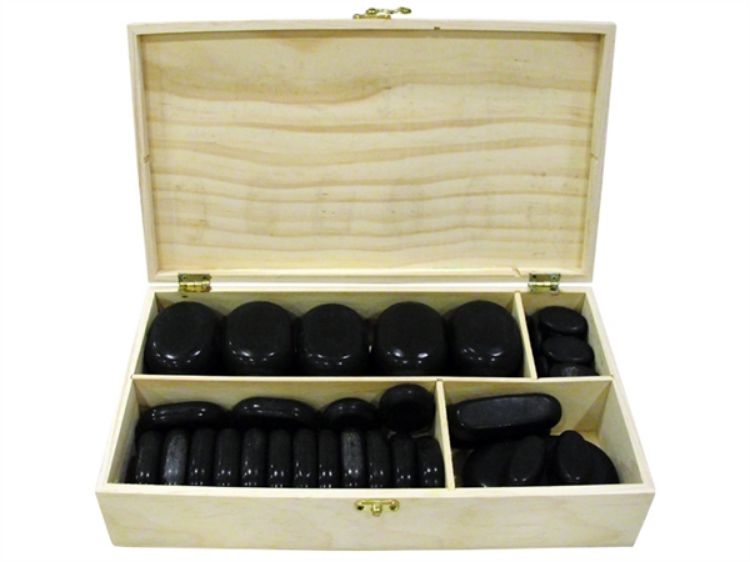Set de 45 piedras de basalto perfectas para realizar masajes de calor terapéuticos, promoviendo la relajación muscular.