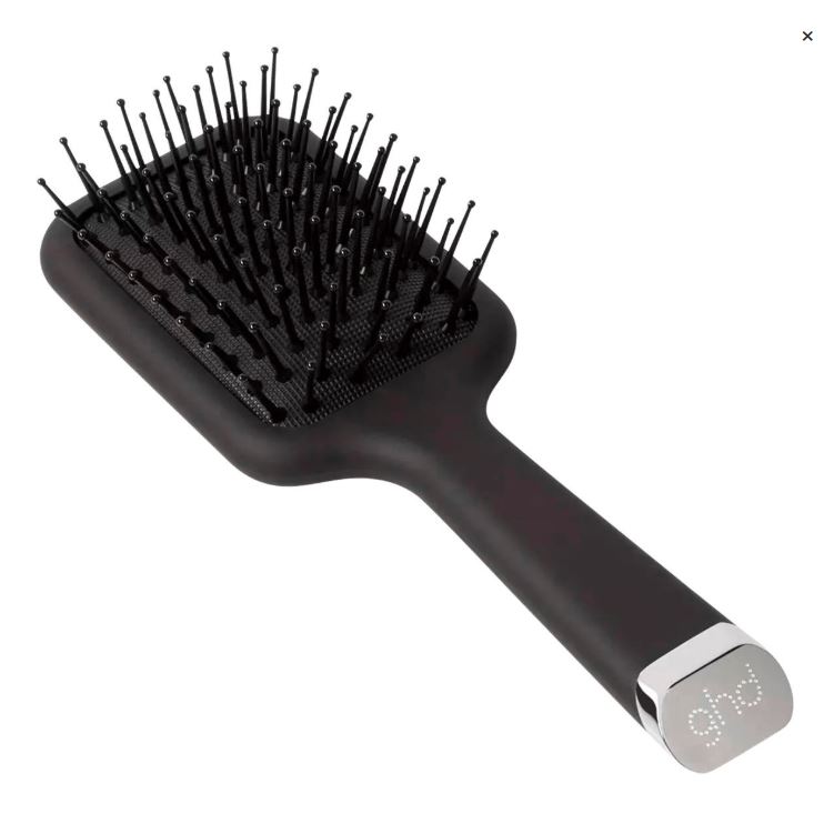 Mini cepillo ghd paddle, perfecto para retoques rápidos en cualquier momento y lugar (6x18 cm).